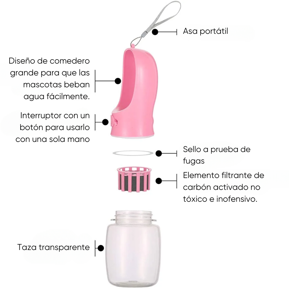 ¡Mantén a tu perro hidratado y saludable en todo momento! Diseñada especialmente para satisfacer las necesidades de tu mascota, esta botella portátil y conveniente te permite llevar agua fresca y filtrada a donde quiera que vayas. El filtro de carbón integrado elimina los olores y sabores no deseados del agua, asegurando que tu perro siempre disfrute de agua limpia y deliciosa. Así, tu perro nunca se quedará sin agua cuando estén fuera de casa.