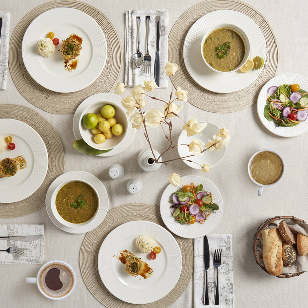 ¡Viste tu mesa con elegancia al comer o cenar! Este juego de vajillas es adecuado para 4 personas, tiene platos para guisos, platos para ensalada o postre, cuencos y tazas. Su diseño esmaltado protege tu vajilla de ralladuras.