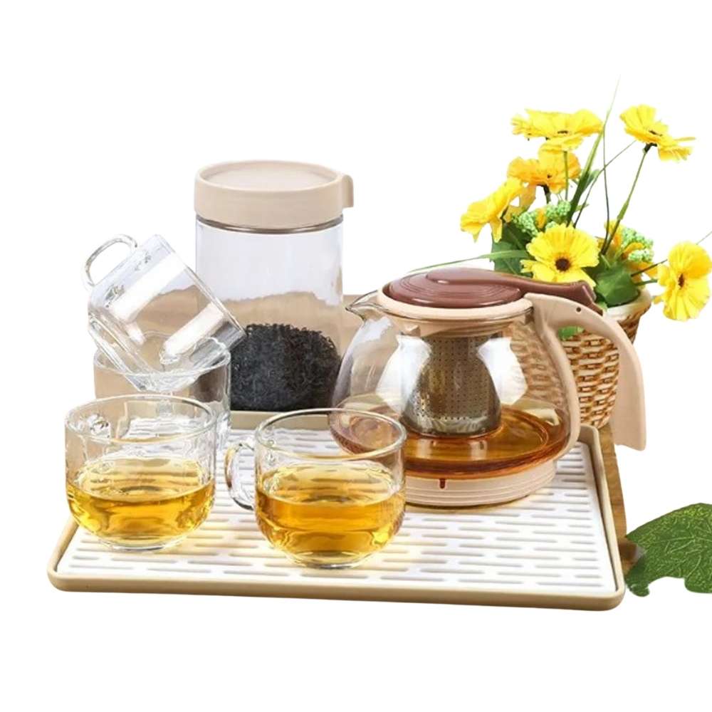 ◊ Incluye: 7 piezas (1 tetera con filtro, 1 recipiente de té, 1 bandeja escurridora, 4 tazas).