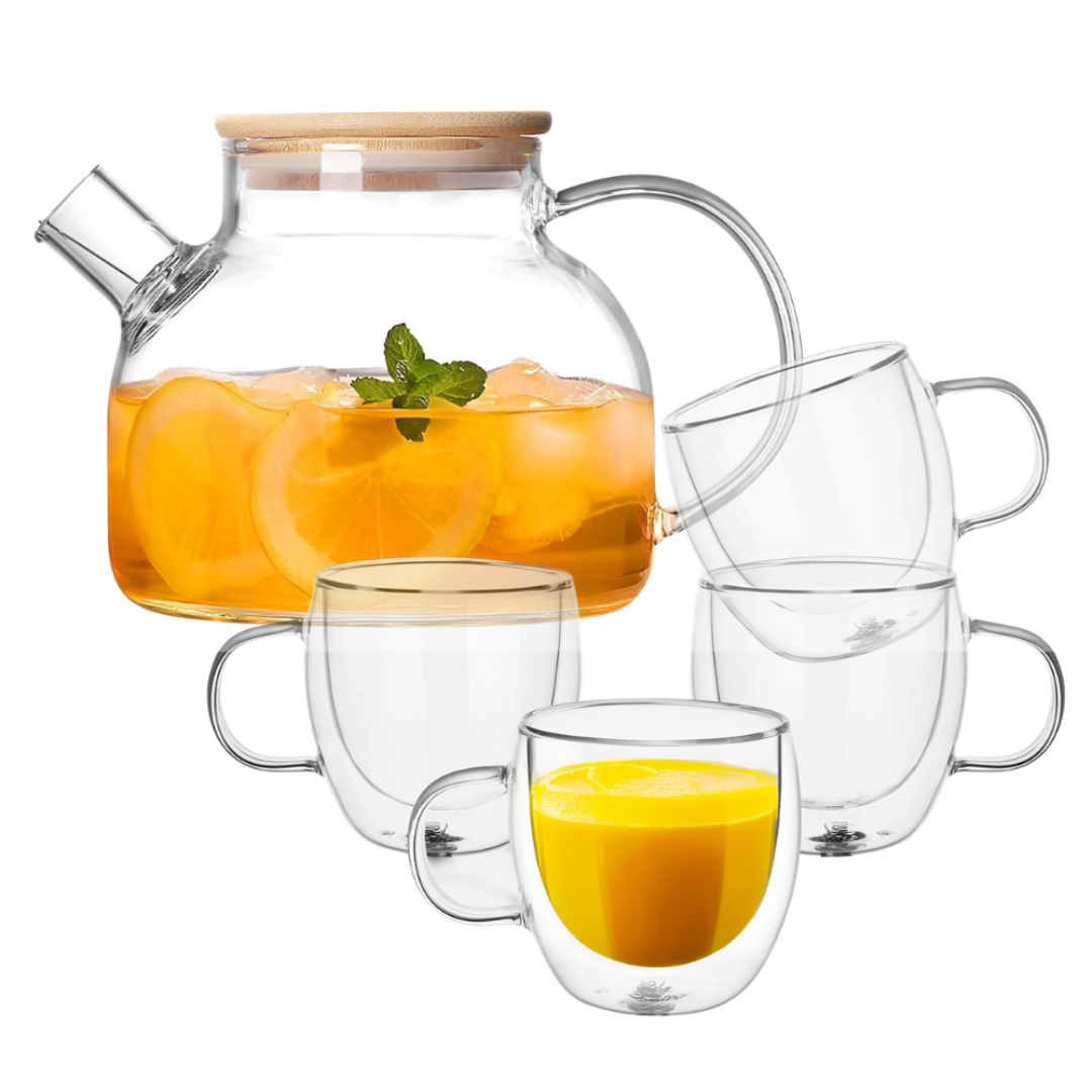 Kit de Té Tetera con Tapa de Bambú más Set de 4 Tazas Doble Pared