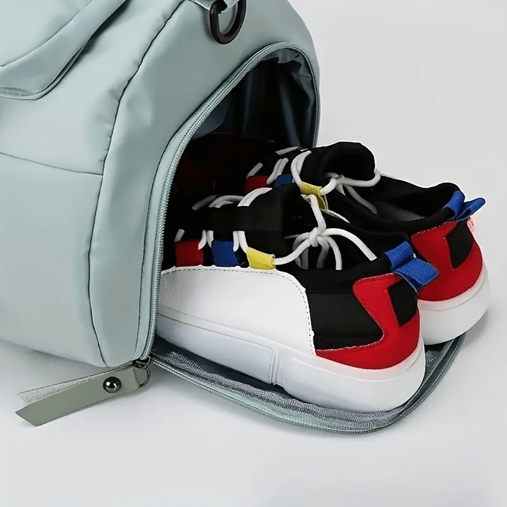 ◊ Con compartimentos separados: 7 compartimentos diferentes pueden separar fácilmente su equipaje. Esta bolsa de deporte con compartimento separado para zapatos ofrece espacio para zapatillas hasta la talla 45, transpirable e higiénica.