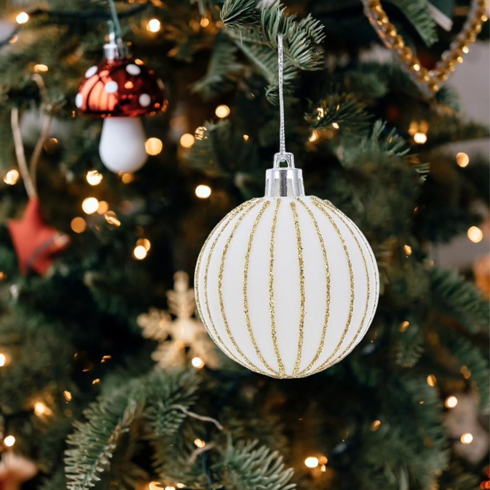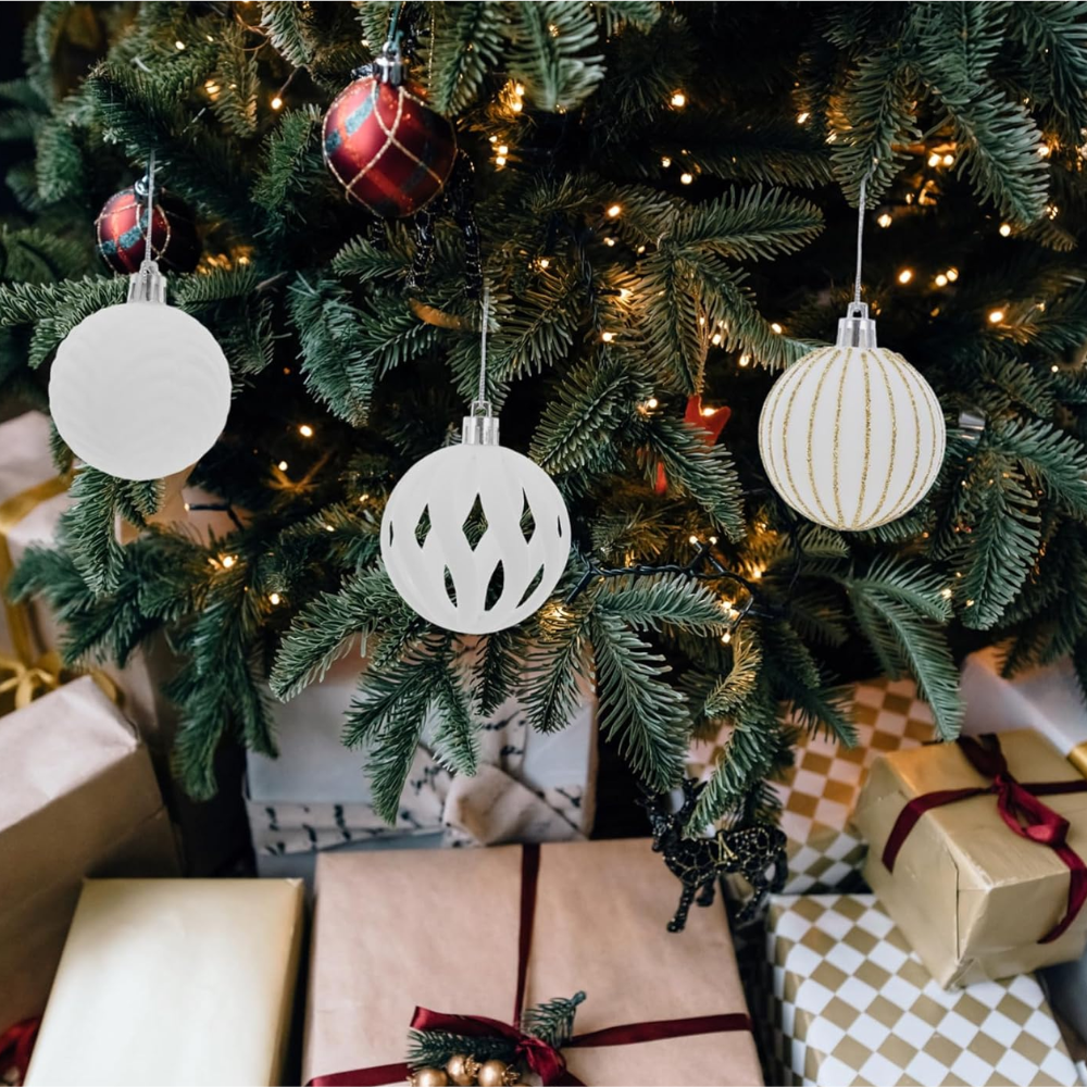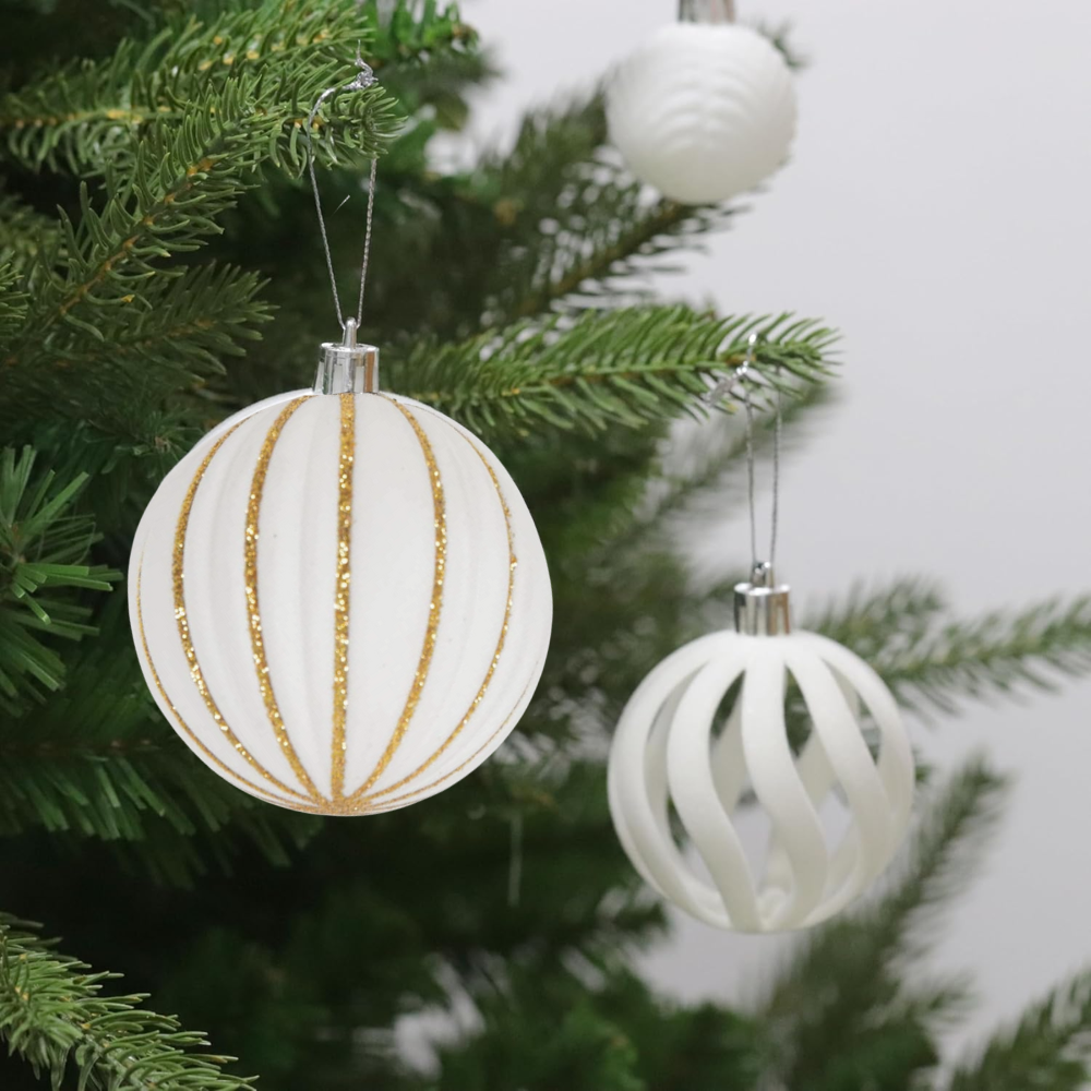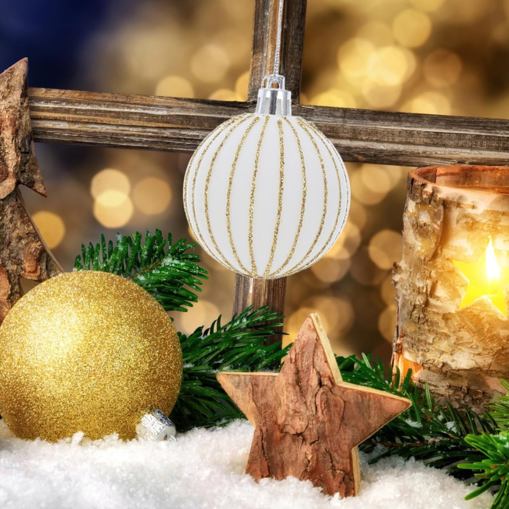 ◊ El set incluye bolas en un color blanco clásico con detalles en dorado, lo que añade un toque de brillo y elegancia a la decoración navideña.