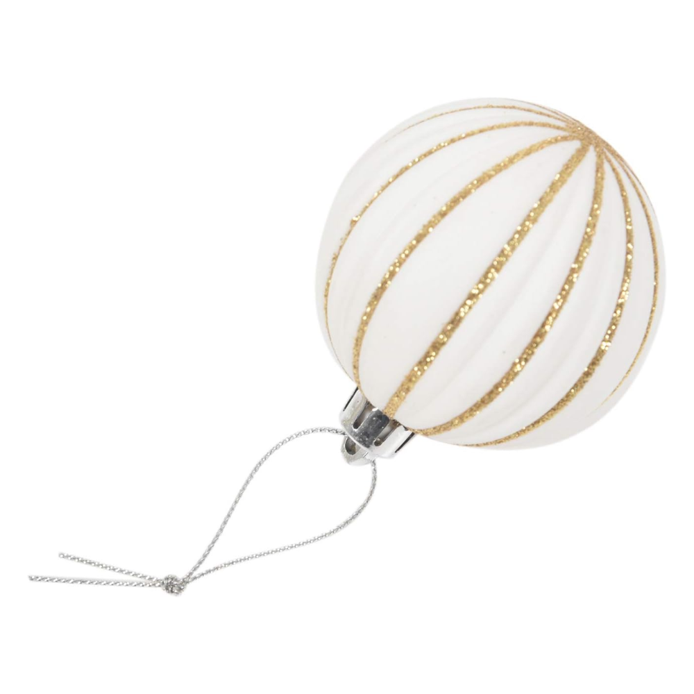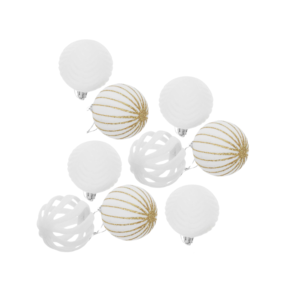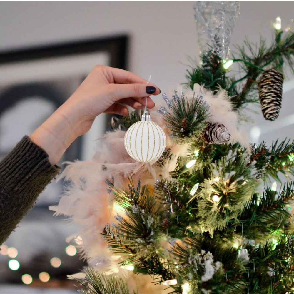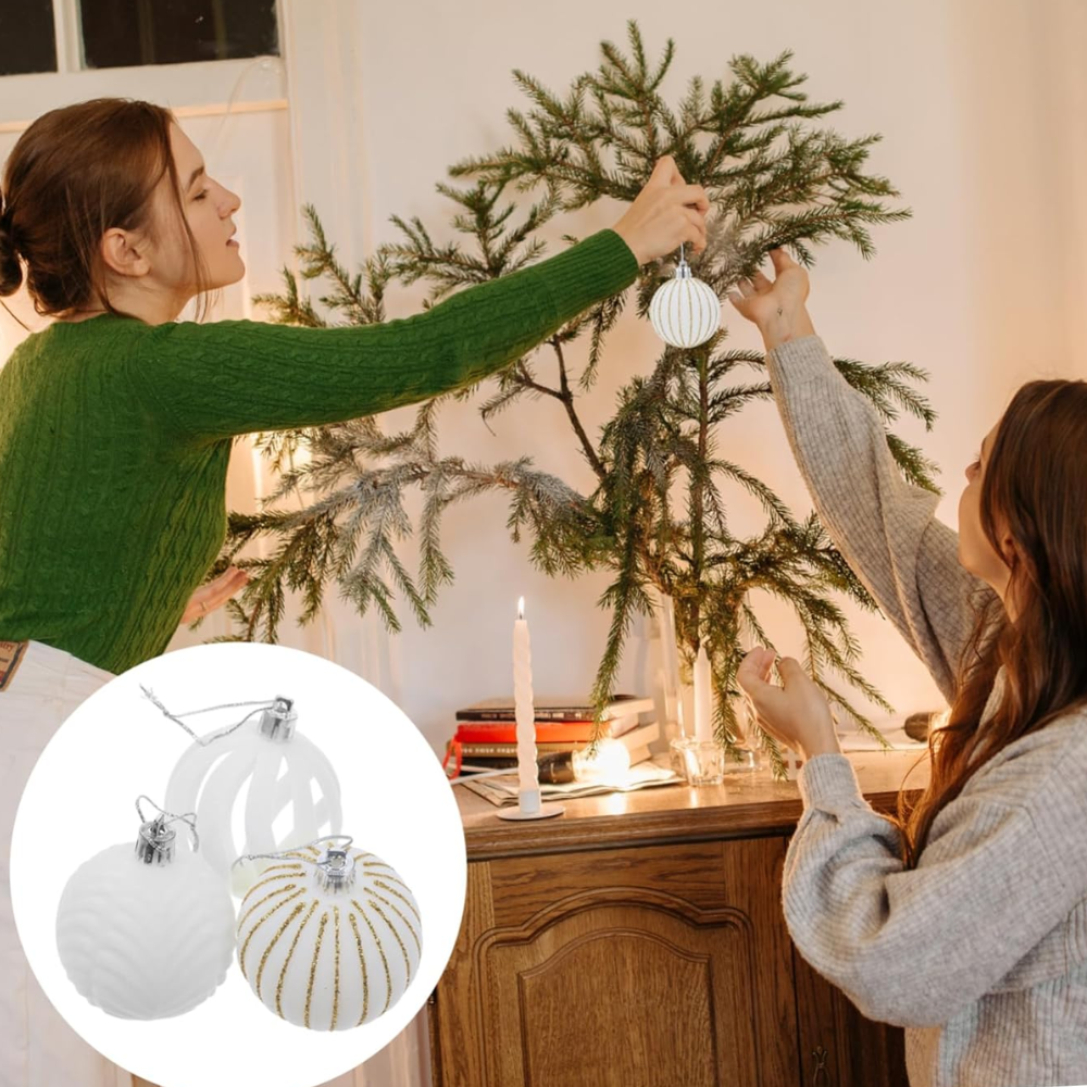 ◊ El set incluye bolas en un color blanco clásico con detalles en dorado, lo que añade un toque de brillo y elegancia a la decoración navideña.