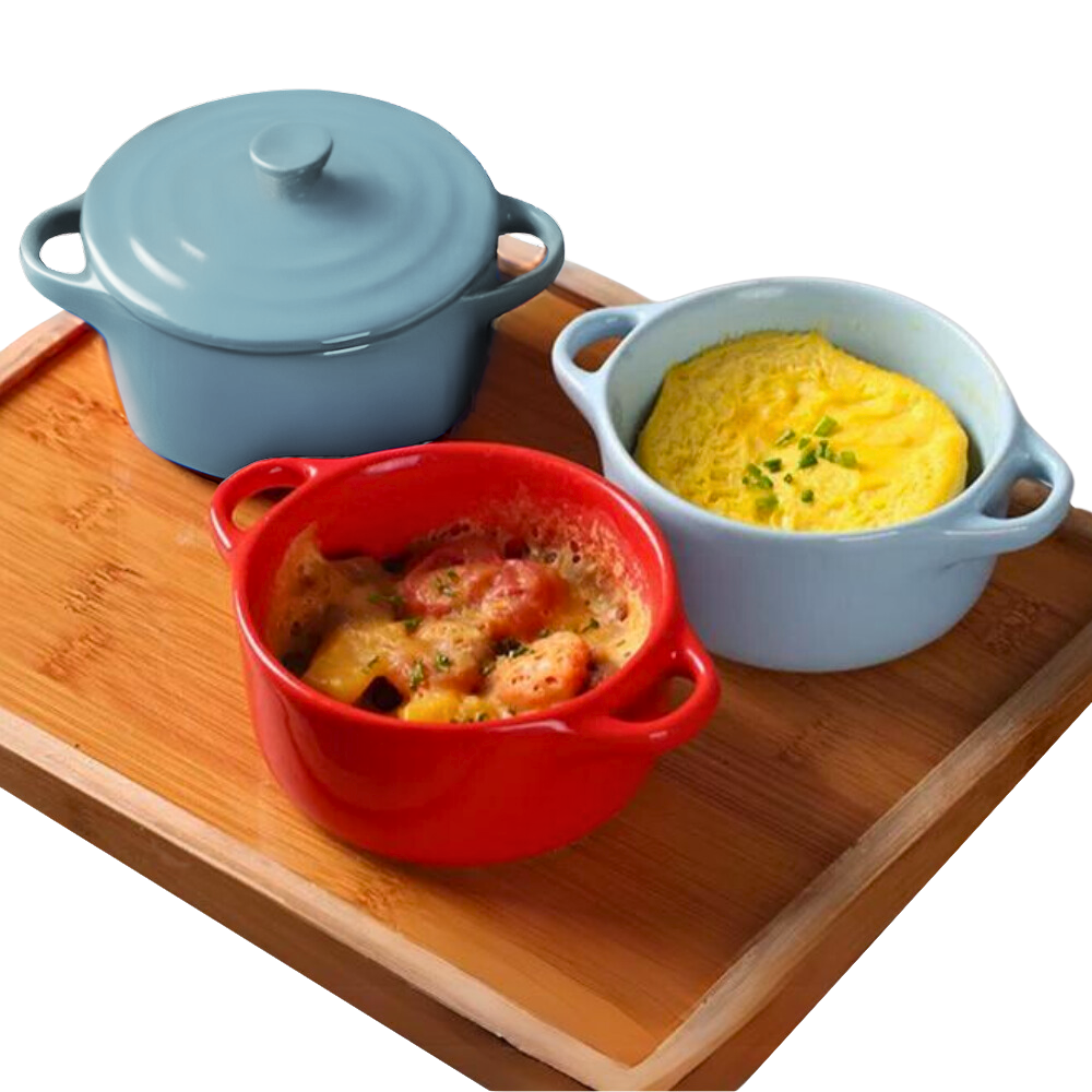 ¡Dale color y versatilidad a la presentación de tu mesa! Sorprende a tus invitados en tus reuniones, brindándoles una diferente forma de servir tus bocaditos o platos preferidos. Los colores de estas mini cacerolas, le dan un toque de calidez a tu mesa. Pueden usarse para servir soufflés, pudines, piqueos, usarlos en el desayuno, almuerzo, cena.