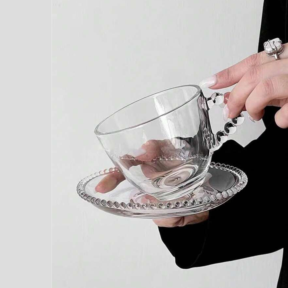 ◊ Este encantador set de tazas y platos de vidrio con borde de esferas es perfecto para disfrutar café, té o infusiones con estilo.